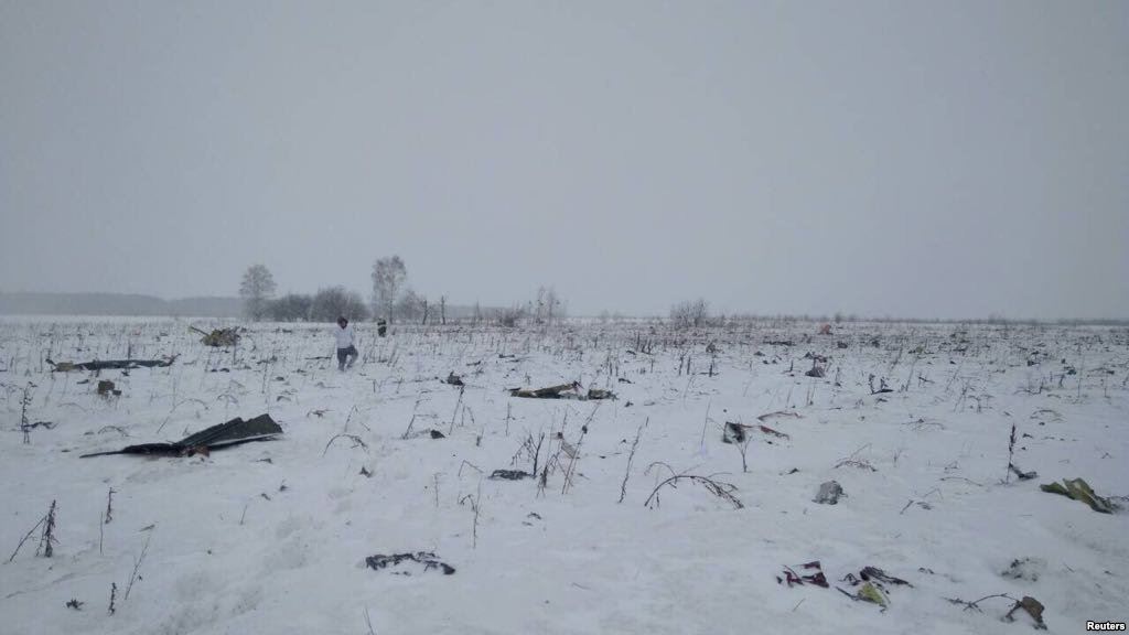Спасатели, работающие на месте крушения, говорят, что разлет обломков составляет около километра, найден один из "черных ящиков".