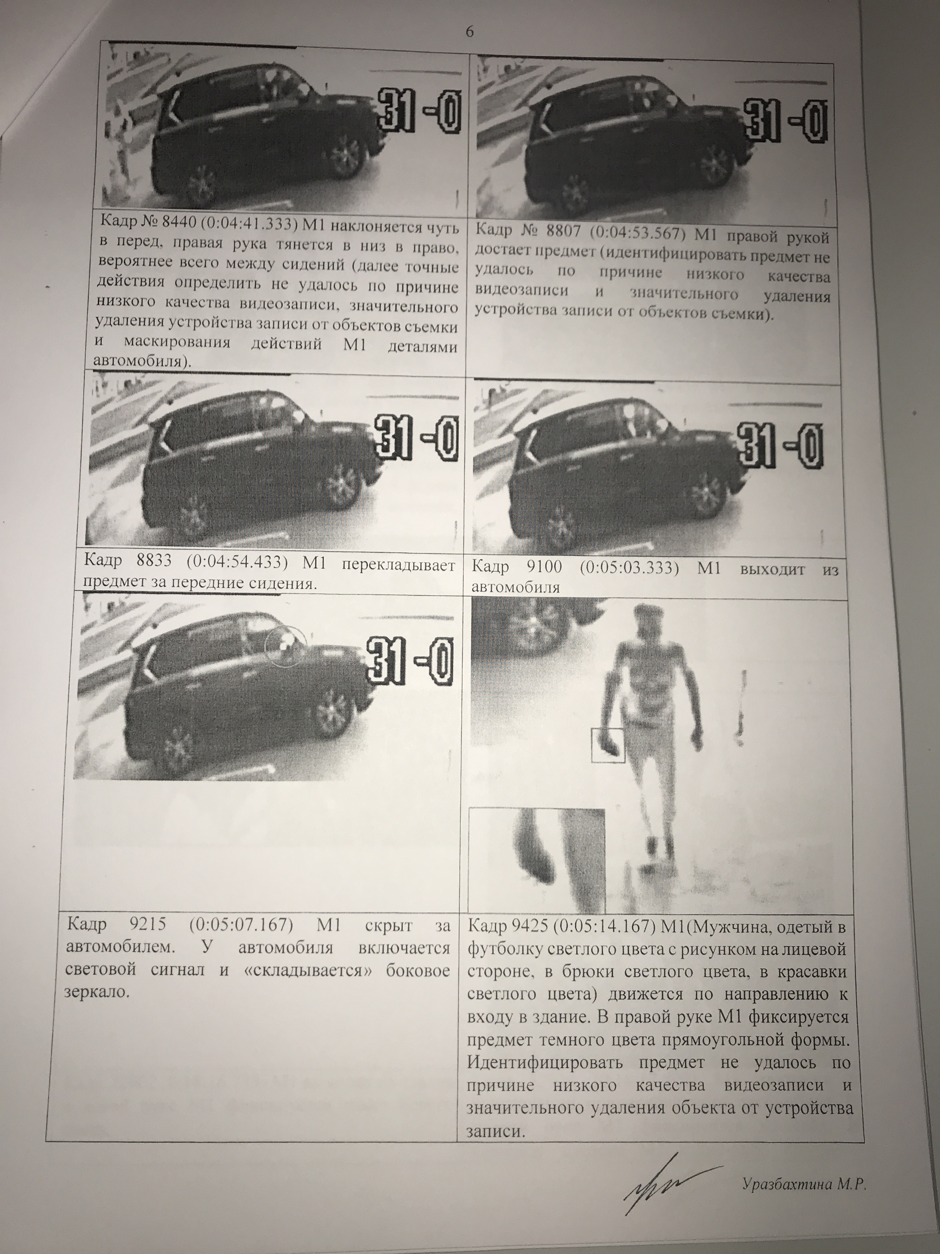 На часах, если верить таймеру на записи с камер наблюдения над входом в «Омский», было 20:53. В 20:55, согласно той же записи, из микроавтобуса вышел человек, одетый в черное — как выяснится позже, это был оперативник ФСБ Владимир Сохряков. Он открыл «Лексус» с помощью брелка и сел на место водителя; дальнейшие его действия разглядеть трудно из-за плохого качества записи — видно лишь, что он совершает какие-то движения руками. Менее чем через минуту Сохряков вышел из внедорожника. В 22:50 начался осмотр «Лексуса», в ходе которого в машине обнаружили конверты с кокаином.