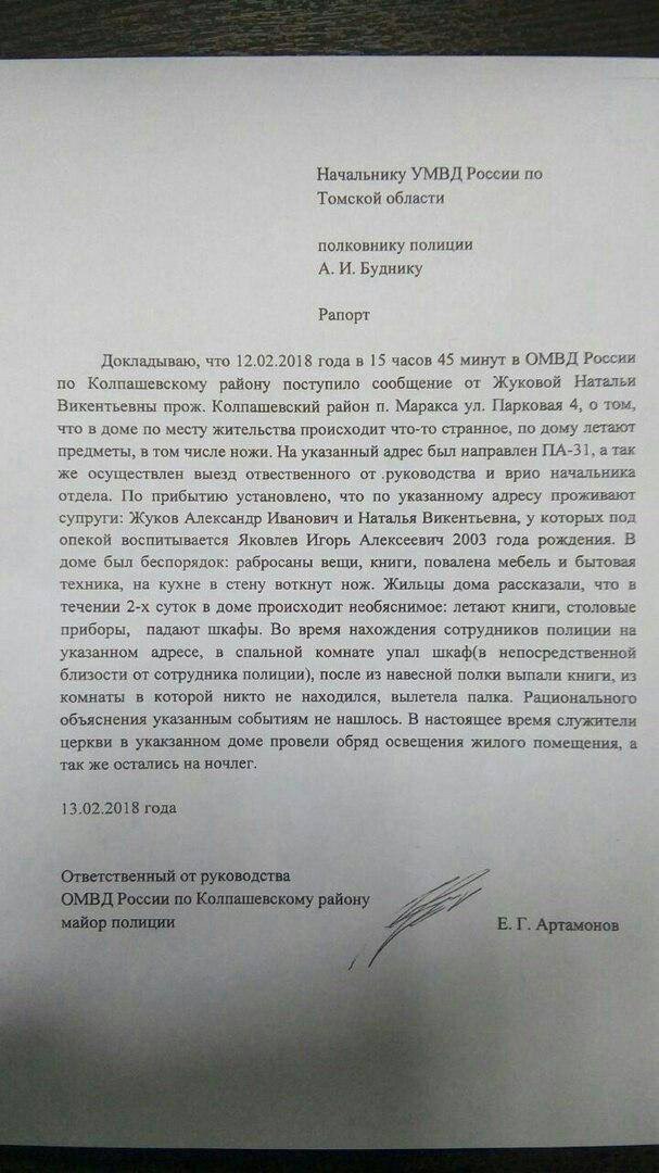 В Томской области сотрудники полиции проверяют инцидент с полтергейстом. Об этом свидетельствует полицейский рапорт, который удалось засвидетельствовать «Ленте.ру» в областном УМВД.