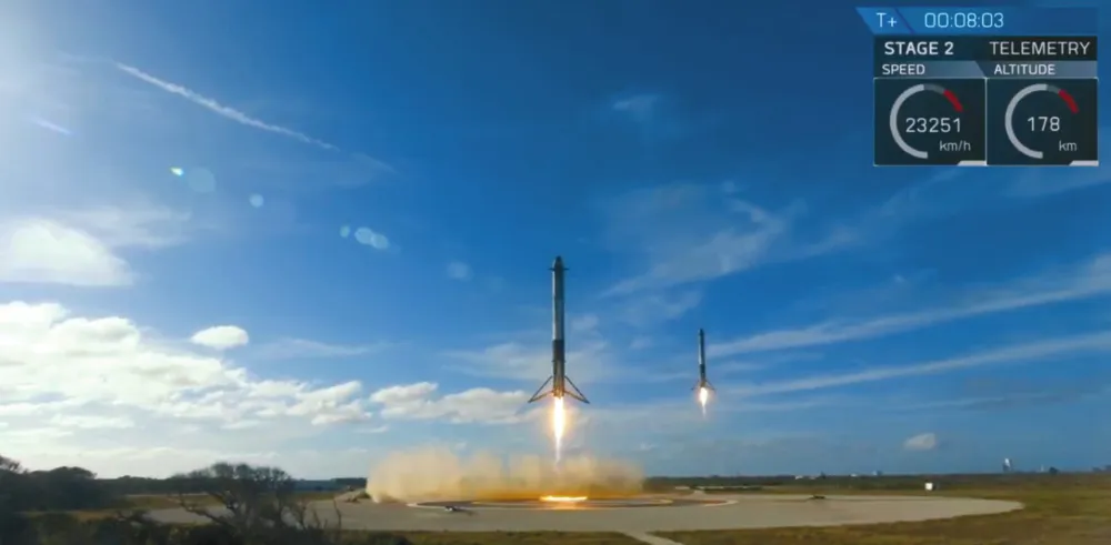 6 февраля 2018 года успешно стартовала самая мощная ракета современности Falcon Heavy. Ее груз отправлен в сторону Марса и стал рукотворным астероидом на гелиоцентрической орбите. Самые эффектные кадры — синхронная посадка двух боковых сегментов первой ступени на специальные площадки космодрома на мысе Канаверал.
