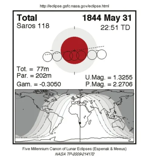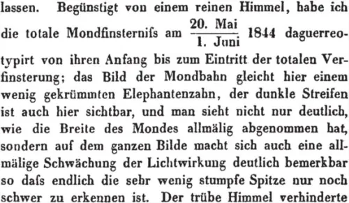 «Воспользовавшись ясным небом, я дагерротипировал полное лунное затмение 20 мая (1 июня по новому стилю) 1844 года с его начала до наступления полного затмения; изображение следа Луны напоминает здесь немного изогнутый бивень слона, здесь также видна темная полоса, и не только видно отчетливо, как ширина Луны постепенно уменьшалась, но также на всём изображении становится отчетливо заметным постепенное ослабевание действия света, так что наконец только очень маленькое тусклое острие можно различить с трудом», — пишет Кнорр. Указанная часть затмения, по данным NASA, длилась в Казани с 00:26 до 01:29 по местному времени, то есть выдержка превысила один час.