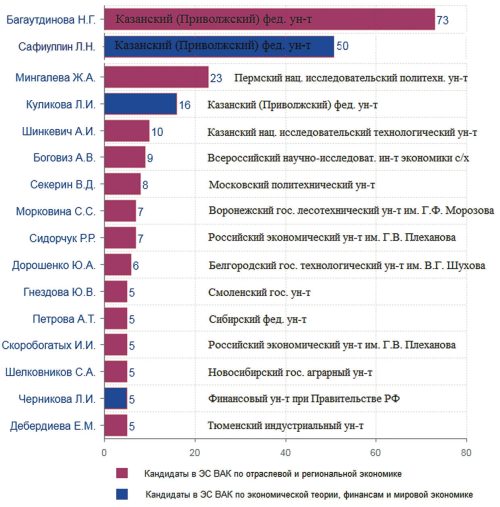 Ситуацию с экспертным советом по отраслевой и региональной экономике можно назвать катастрофической. Около 40% кандидатов (33 из 80) причастны к сопровождению диссертаций с массовыми некорректными заимствованиями, или обладают неоригинальной диссертацией, или имеют смутные представления об академической этике, или всё вместе. А с учетом лиц, которые публиковались в «мусорных» журналах Scopus, их число достигает 46 (более 55%). Например, на счету Наили Гумеровны Багаутдиновой из Казанского федерального университета 27 сопровожденных липовых диссертаций, по данным «Диссернета» [6]. Одна из ее соискательниц Ю. В. Жильцова уже лишена степени доктора экономических наук в апреле 2017 года [7]. И если в диссертационном совете в соответствии с новой нормой Н. Г. Багаутдинова не может заседать в течение 5 лет, то в отношении экспертного совета ВАК таких ограничений нет.