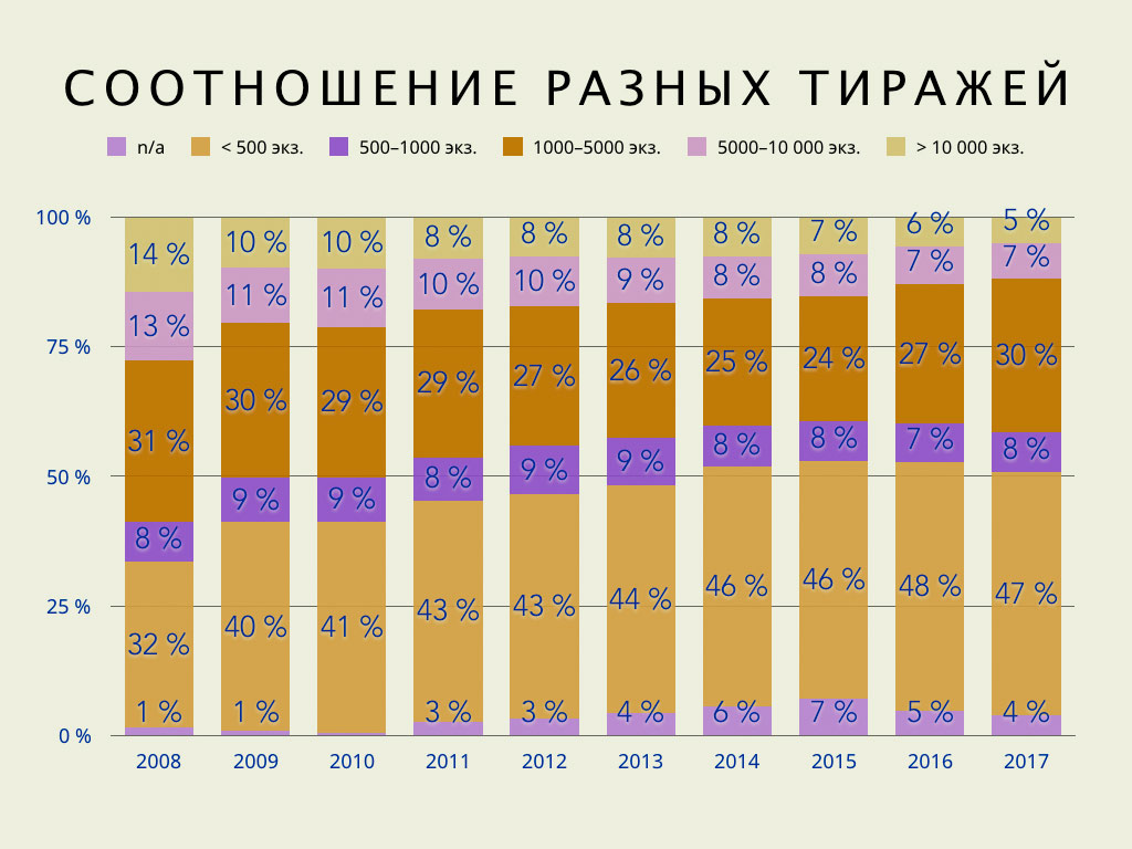 С другой стороны, маленькие, если не сказать мизерные, тиражи уже давно представляют большую, если не бóльшую, часть всего ассортимента. Тиражи меньше 500 экземпляров за прошедшее десятилетие занимают уже не треть, а почти половину всего ассортимента. Доля привычных средних тиражей практически восстановилась до докризисных 30% (и, без сарказма, это, наверное, единственная обнадеживающая новость от всей этой статистики), но в два раза сократилась доля приличных тиражей (5–10 тыс. экз.), а доля бестселлеров — книг, печатающихся тиражом более 10 тыс. экз., — сократилась в три раза. В России стало очень мало бестселлеров, зато много разных книг для очень маленьких аудиторий.