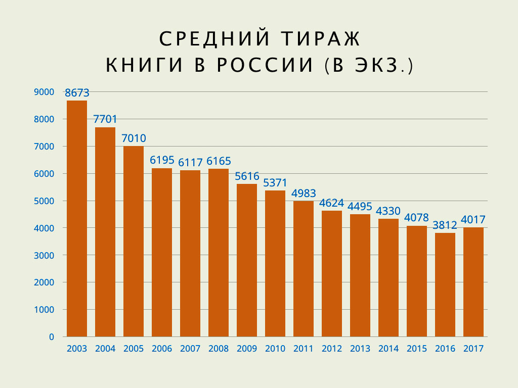 Кто там на третьем или, прости господи, десятом месте? Да имеет это хоть какое-то значение? Что, думаю, имеет значение, так это то, какие данные в статистику книжной палаты «не попадают». А туда не попадают данные о публикации книг авторов, которые предпочитают не связываться с обычными издателями или с которыми не хотят иметь дело сами издатели. У книг, которые такие «самоиздающиеся» авторы публикуют и которые продаются или в магазинах электронных книг, или даже в печатном виде (по принципу «печать по запросу») при помощи сервисов типа Rideró, есть все признаки обычного издания — тот же ISBN, например. Официальная статистика их, однако, практически не учитывает, потому как электронные книги закон об обязательном экземпляре в упор не видит вообще, а издания, напечатанные по запросу — в частности. Не исключено, что принципы учета изменятся (Книжная палата, во всяком случае, очень старается это сделать, за что спасибо ей большое!), но пока из 14695 книг, опубликованных в том же Rideró в 2017 году, в статистику попали только 684 книги. А жаль, поскольку 14,7 тыс. книг — это больше ассортимента ЭКСМО или АСТ и немногим меньше совокупного каталога ЭКСМО и АСТ. Тиражи у самиздата, пока и за редким исключением, не идут ни в какое сравнение с тиражами традиционных издательств: средний (печатный + электронный) тираж книги в Rideró — 20 экземпляров, а у обычного издательства — 4017 экз. в 2017 году. Что, кстати, больше, чем в позапрошлом году, но всё еще заметно меньше средних тиражей прошлых лет: