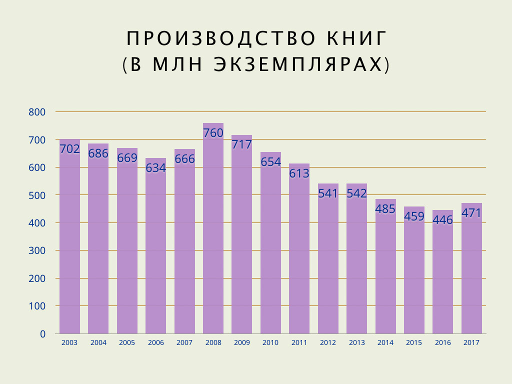 Заявленные тиражи изданных в прошлом году в России книг (напомню, что статистики продаж книг в России не велось, не ведется и в ближайшей перспективе вестись не будет; а вот статистика выпуска — есть, и мы ее тут и обсудим) выросли, причем заметно, — сразу на 25 млн экземпляров (то есть на 6%), так что валовой тираж составил 471 млн книг, превысив показатели не только позапрошлого, 2016-го, но и 2015 года: