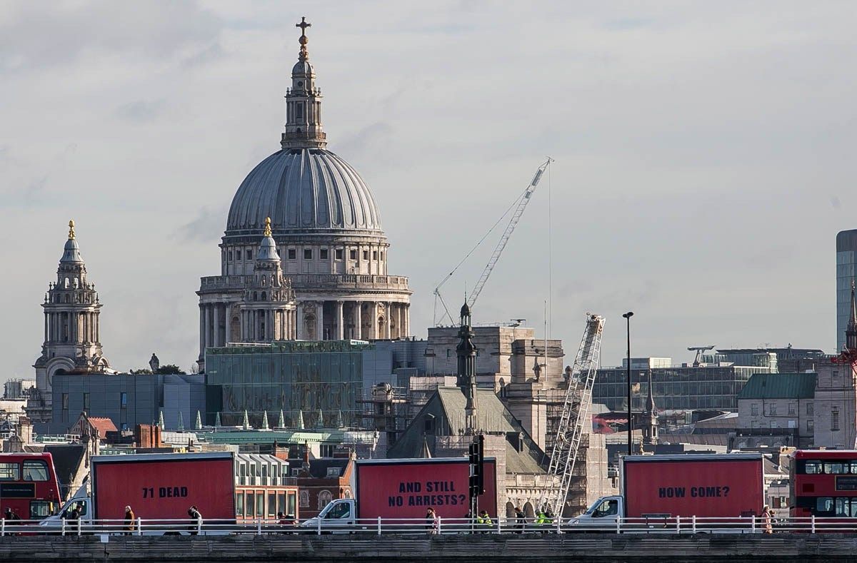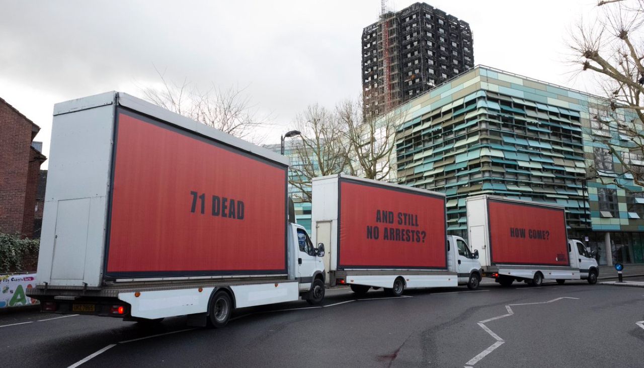 15 февраля в разных точках британской столицы — в том числе напротив парламента Великобритании — появились три красных билборда, похожие на рекламные щиты из нового фильма Мартина Макдонаха «Три билборда на границе Эббинга, Миссури». На одном из них было написано «71 погибший», на втором — «И ни одного арестованного», а на третьем — «Как так вышло?» Билборды возили по городу три переоборудованных автофургона.