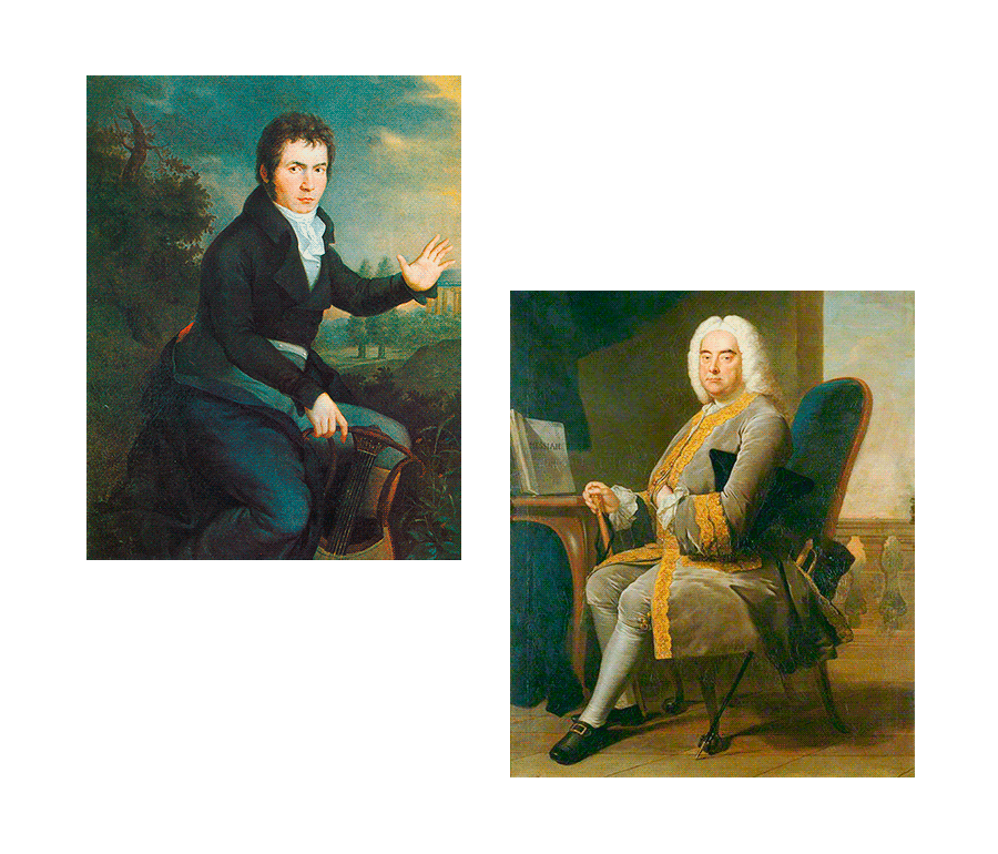 Слева: портрет Людвига ван Бетховена на природе, художник Виллиброрд Йозеф Мэлер, 1804 год. Справа: Георг Фридрих Гендель, художник Томас Хадсон, 1756 год