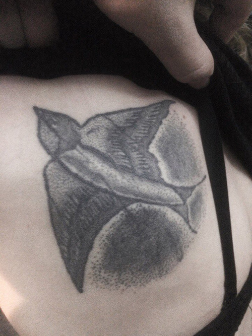 Единственная немного плохая татуировка — это та, которую я делала на себе, еще не натренировавшись. Это был обычный «партак» на ноге. Из-за неудобного расположения получились кривые линии и с разной «глубиной». Сначала было стыдно, но она до сих пор не сведена: для меня это память, благодаря ей я поняла, как тренироваться на людях.