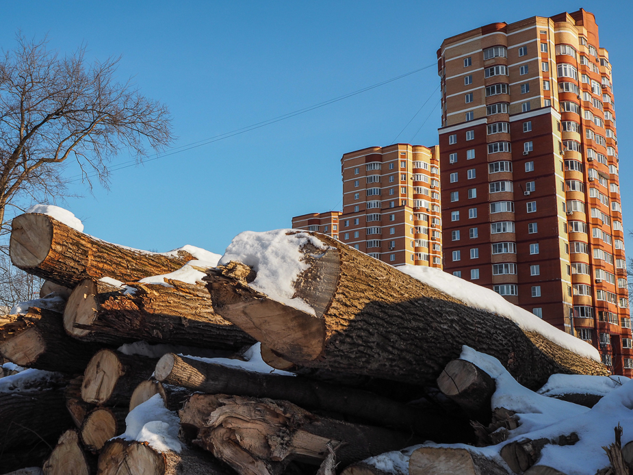 На участке, который стал предметом скандала, до сих пор лежат спиленные деревья. Одни были совсем молодыми, другие древними — в два-три обхвата. Гараж, для обслуживания которого некогда выделили землю, оказался небольшой кирпичной будкой с дырой и многочисленными трещинами в одной из стен.