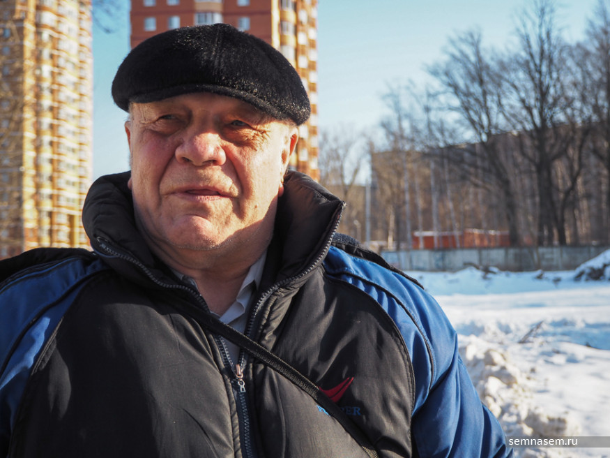 Проходим мимо новостройки, где живет пенсионер. Показывает на козырьки над подвальными помещениями: помещения пустуют — фирма-застройщик обанкротилась, помещения никому так и не сдали в аренду. Мечтает, что музей героев Отечественной войны появится в цокольном этаже.