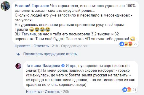 Другие, отбросив эмоции, восхищаются тем, как авторам ролика удалось попасть в свою целевую аудиторию. Так, бурное обсуждение развернулось на странице известной актрисы и телеведущей Татьяны Лазаревой в Facebook.