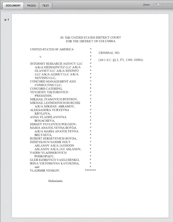 Созванное Мюллером в Вашингтоне Большое жюри (коллегия присяжных заседателей) утвердило обвинения против трех российских организаций и 13 физических лиц, которым теперь рекомендуют тщательно выбирать маршруты своих заграничных странствий. Помимо известного своей близостью к Путину и Министерству обороны РФ Евгения Пригожина, в списке физлиц еще двенадцать человек, работавших на него: Михаил Быстров, Михаил Бурчик, Александра Крылова, Анна Богачева, Сергей Полозов, Мария Бовда (она же Беляева), Роберт Бовда, Джейхун Асланов, Вадим Подкопаев, Глеб Васильченко, Ирина Каверзина и Владимир Венков.