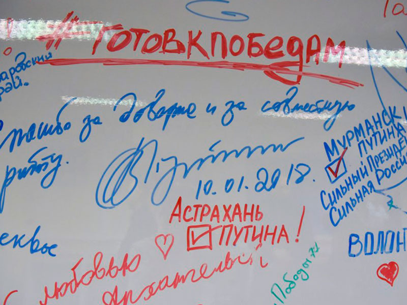 Офисная доскав штабе В.Путина / АГН "Москва" / фото: Кардашов Антон Основными темами агитроликов в поддержку Путина станут целостность и укрепление страны, улучшение жизни граждан и социальная справедливость, дальнейшее движение России вперед, уважение традиций, укрепление обороноспособности. Президент отказался от съемок и записи реплик для предвыборных роликов. Главным их лозунгом остается тезис «Сильный президент — сильная Россия».
