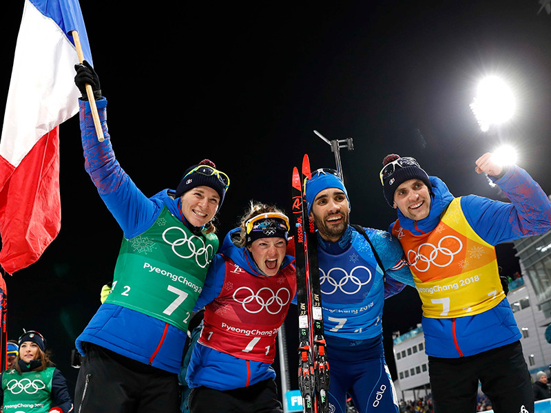 Олимпийскими чемпионами в составе французов стали Мари Дорен-Абер, Анаис Бескон, Симон Дестье и Мартен Фуркад. Двукратный чемпион Сочи-2014 Фуркад выиграл в Пхенчхане уже третье золото, став таким образом пятикратным олимпиоником.