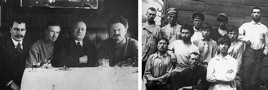 Слева — Первые реальные высшие руководители Красной армии. Справа налево — Председатель РВСР Л.Д. Троцкий, Главком всех вооруженных сил Республики И.И. Вациетис, член РВСР, начальник оперативного отдела Наркомвоена С.И. Аралов, член коллегии Наркоммора С.Е. Сакс. (В момент совещания в поезде Троцкого, бывший вагон Николая II). Справа — Немногие из многих, кто с оружием в руках отстаивал свое право не служить ни «красным», ни «белым»: группа участников одного из крестьянских восстаний против «комиссародержавия» и возвращения «старого режима». Тамбовская губерния, 1920 год. (ЦГА КФД)