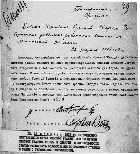 Воплощение мифа. Фотография, изготовленная в 1923 году для выставки «5 лет РККА». Неизменно выдавалась за подлинный документ февраля 1918 года