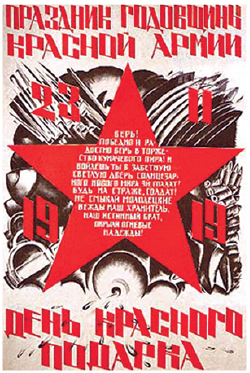 Спустя год 23 февраля 1919 года был объявлен Днем красного подарка — речь шла о добровольных пожертвованиях со стороны населения фронтовикам. Сохранились документы, которые свидетельствуют, что предложение о Дне красного подарка было сформулировано заместителем Троцкого Э.М. Склянским еще в январе 1919 года. К 23 февраля были подготовлены плакаты, организованы митинги и — самое главное — проведены массовые конфискации. Красная армия действительно нуждалась в теплой одежде, в лекарствах, но обнищавшее и само еле-еле выживавшее население не спешило отдавать последнее. Вот этими конфискациями и запомнилось 23 февраля — до тех пор, пока еще были живы те, кто помнил эти страшные годы.