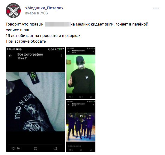 В разговоре с «Бумагой» один из администраторов паблика «Модники Питера», схожей по тематике с «Отжатым шмотом», где публиковались видео с избиениями петербургских подростков, отрицает, что сообщество относится к радикальным и политическим движениям.