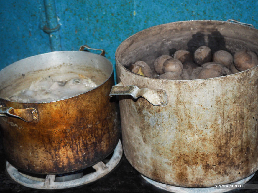 Отправляемся на осмотр его курятника, на который пенсионер не нарадуется: «Каждый день по восемь яиц своих — не чета магазинным!». По дороге захожу на кухню, где на видном месте стоит практически антикварная фигурка Деда Мороза, покрытая копотью. Консервная банка с окурками, карта мира, старые газовые плиты с дверцами духовых шкафов, отломанными и перевязанными веревочками. На газу стоят две кастрюли с картошкой «в мундире» и куриными головами.