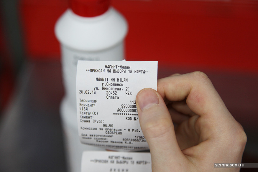 — У нас в кассовых системах обновление приходит из Москвы, чья это была идея и почему это появилось на чеке, не знаем, — сказала администратор магазина «Спортмастер» Екатерина Гусарова. — Уже примерно месяц у нас на всех чеках — наличных, безналичных, в дополнительных скидках — печатается, чтобы не забывали приходить на выборы 18 марта.