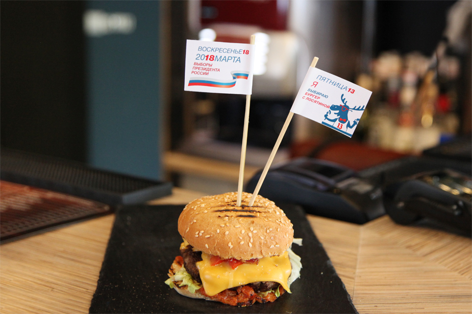 — Это идея барменов, мы делали флажки на бургеры и с новогодней тематикой. Бургеры с лосятиной — это любимое блюдо студентов у нас в рестобаре, а флажками мы напоминаем им про выборы, поскольку сейчас это актуальная тема, — рассказал бизнесмен. — Кстати, как раз нашим молодым гостям предвыборная агитация на их любимых бургерах не очень и понравилась. Мне кажется, бургеры как раз покупать стали меньше.