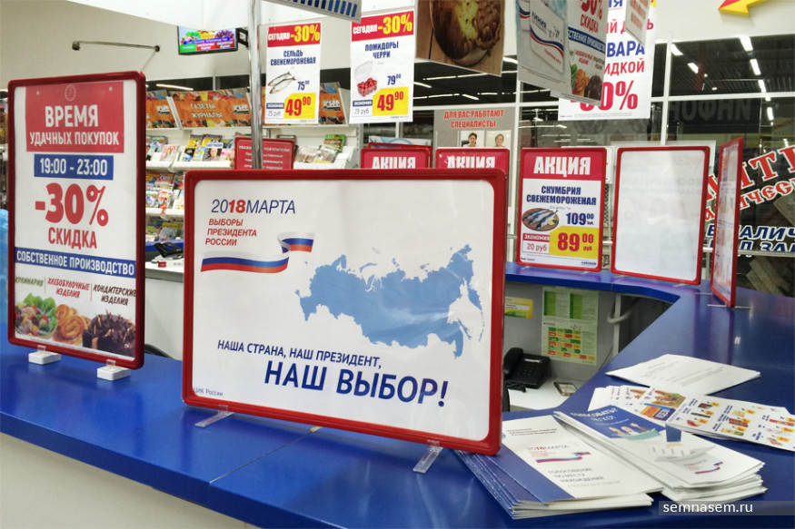 Через некоторое время агитацию разместили торговые сети. В гипермаркете «Линия» на стойке администрации между акциями и скидками появился предвыборный плакат и буклеты.