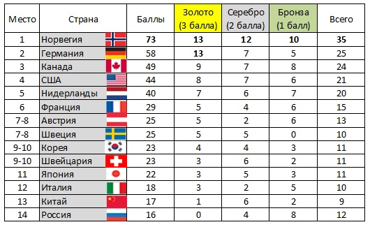 Россия продолжает скатываться как в официальном зачете так и не в официальном. 14 место, после 1-го в Сочи, это просто неприлично. Я 1,5 года назад, после первой волны обвинений России в массовом употреблении допингаписал, что единственное реальное доказательство чистоты России, это следующая олимпиада, если результат будет хоть как-то похож, то все обвинения о массовом приеме допинга в Сочи не более чем наговор и что мы видим - ничего, третья по численности сборная не может показать ни чего интересного провал, по всем направлениям, в Ванкувере в 2010 как мы как раз были на 11 месте, приблизително там где и сейчас, вот это и есть реальный уровень спорта России без всяких накруток.