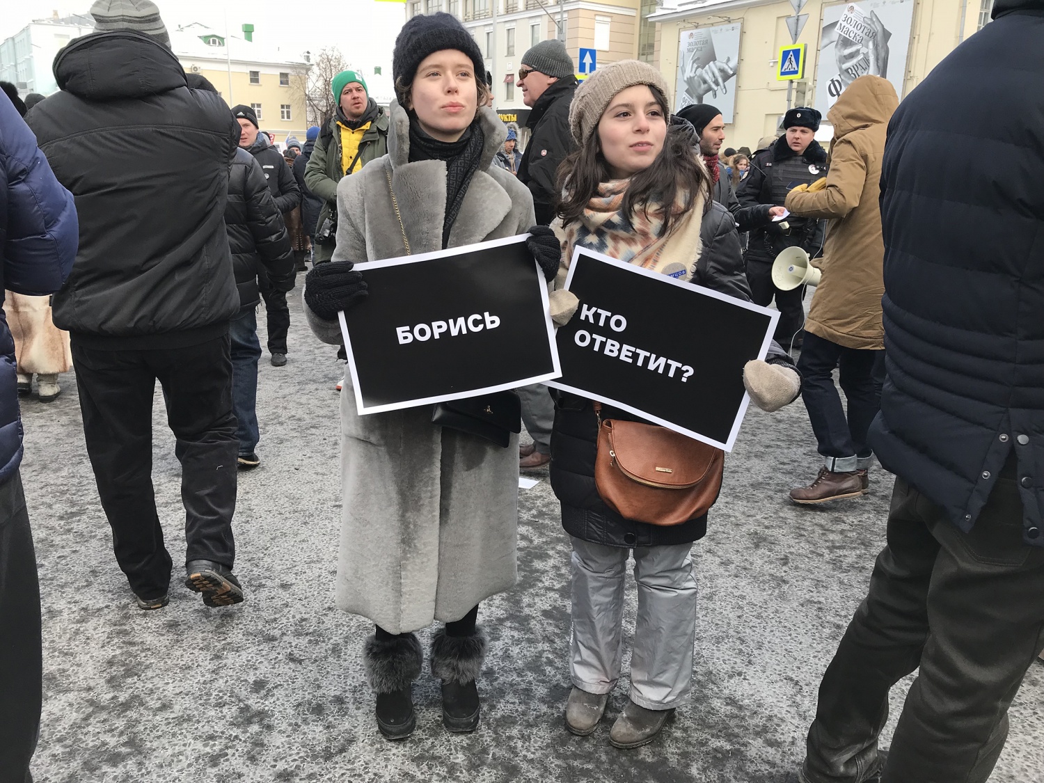 Трое активистов принесли на марш плакаты, стилизованные под рекламные щиты из фильма «Три билборда на границе Эббинга, Миссури». На одном из плакатов было написано «Убит на глазах у Кремля», на втором — «И стоящий за этим все еще на свободе?», на третьем — «Как так, правитель Путин?»