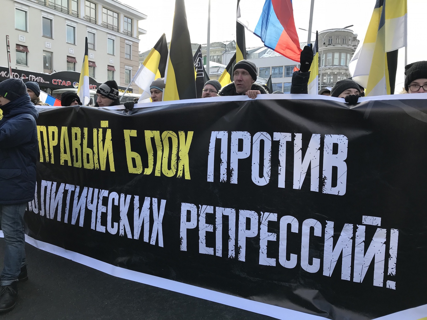 Вслед за главной колонной шли две небольшие колонны националистов. На марше обе колонны пришли выступить против «политического террора». Шедшие в одной из них — около 20 человек — несли имперские флаги и растяжку «Правый блок против политических репрессий!»