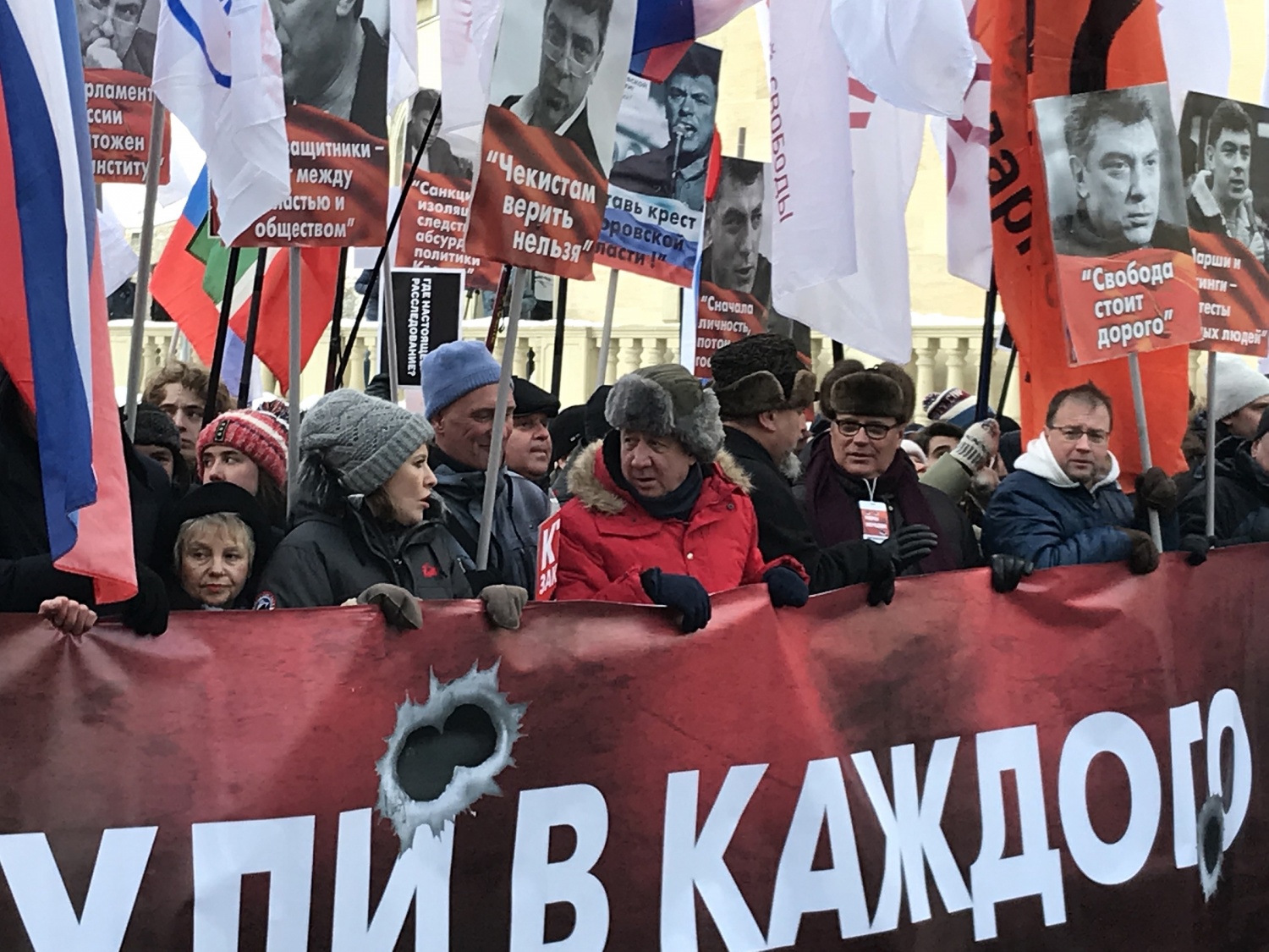Главная растяжка шествия, которую несла шедшая впереди колонна, несколько раз сменялась. Так, участники марша успели пронести баннеры «Эти пули в каждого из нас», «Возмездие неизбежно» и «Свобода стоит дорого». Среди тех, кто нес баннер, была в том числе Собчак.