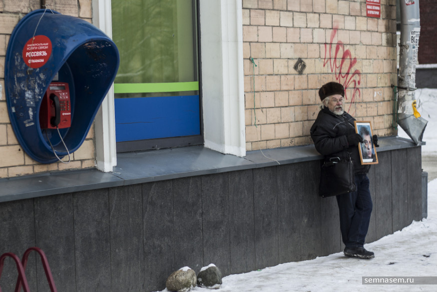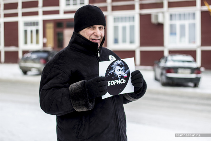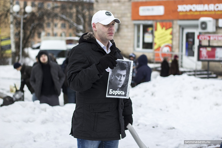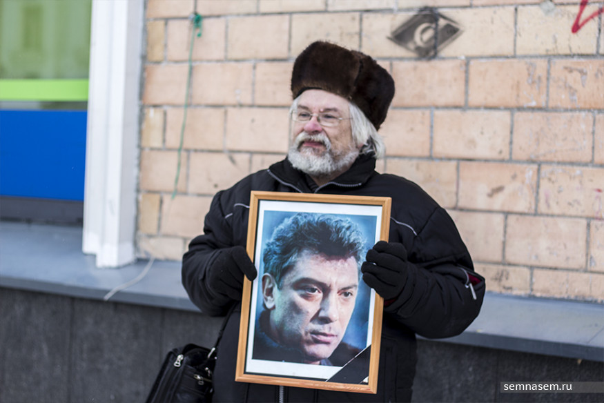Андрей Оборин с большой фотографией Немцова в руках говорит, что к нему только что подходили двое молодых людей. Они купили водку в магазине и несколько минут доставали вопросами, провоцировали. Оборин выходит с портретом Немцова третий год подряд.