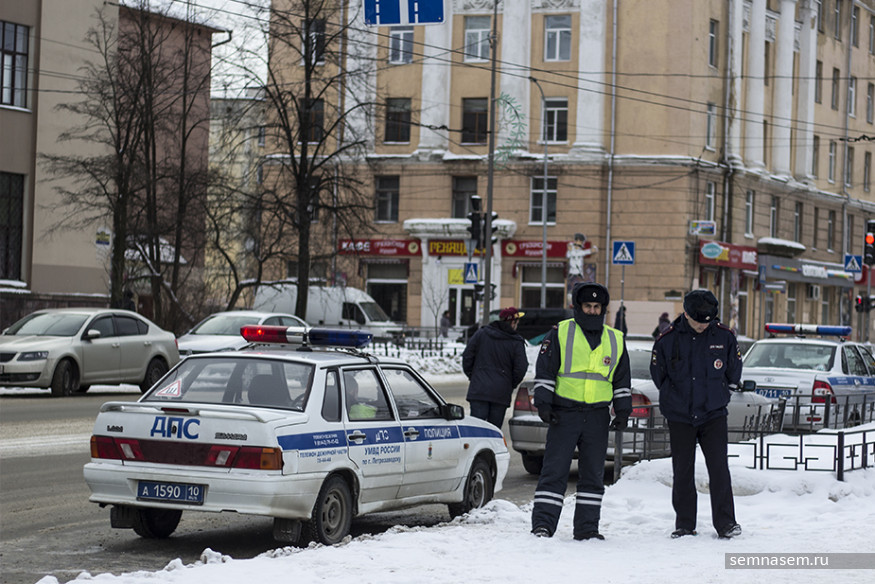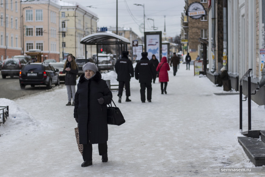 На центральном проспекте в Петрозаводске как после новогодней ночи — людей мало, в основном женщины. По тротуарам парами ходят полицейские.