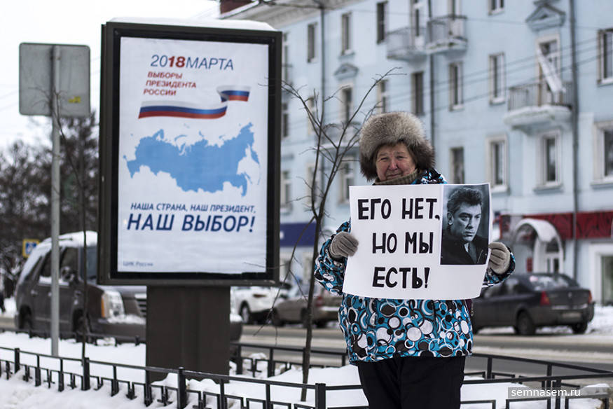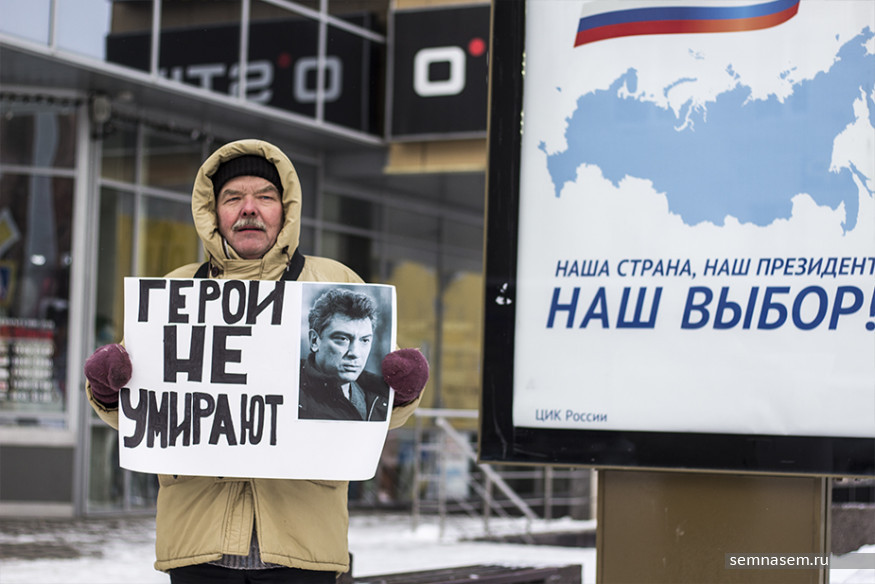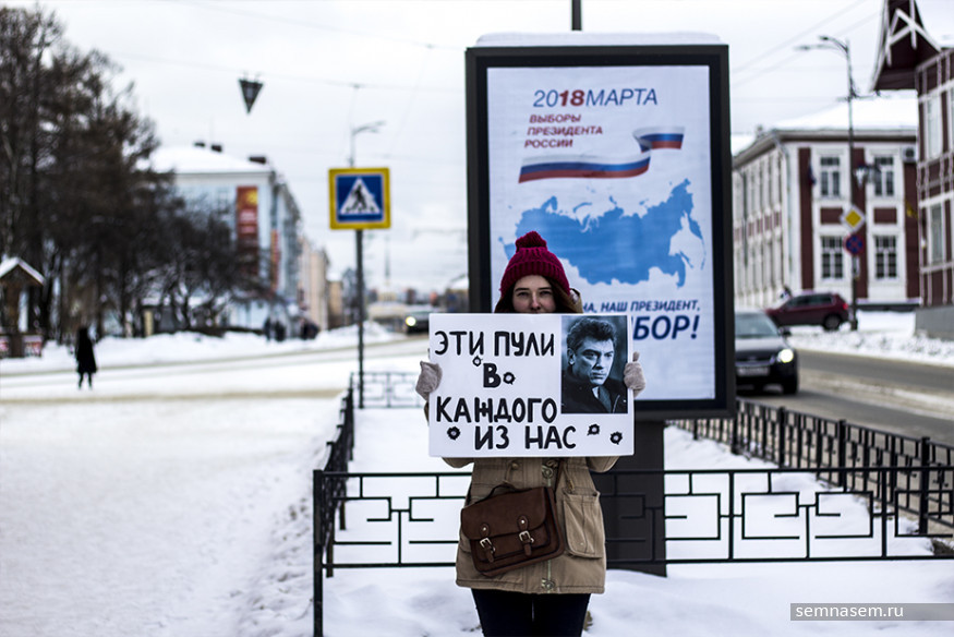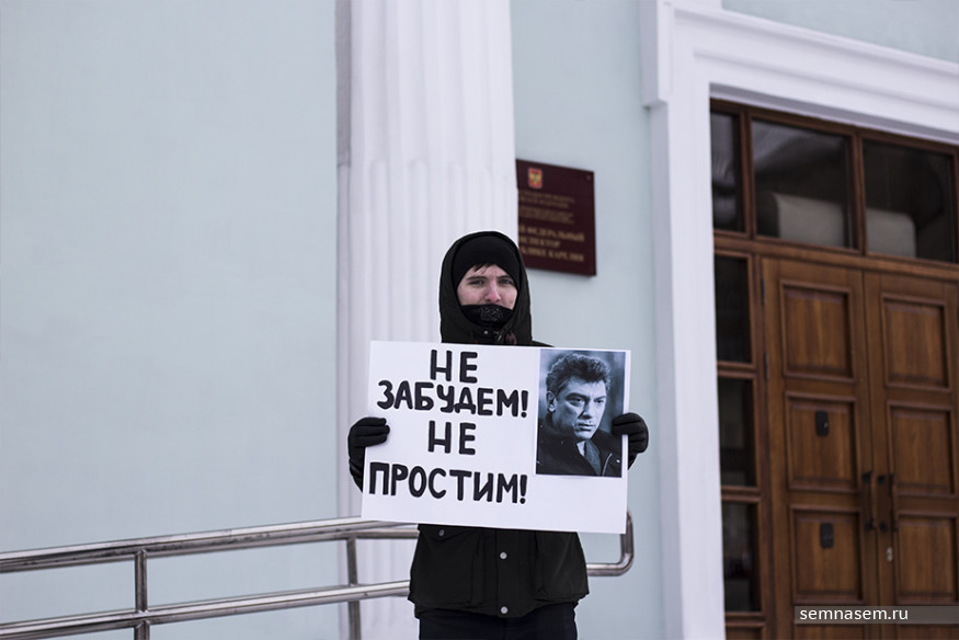 Общественники 25 февраля встали вдоль центрального проспекта Петрозаводска с одиночными пикетами. У всех на платах была фотография застреленного три года назад Бориса Немцова. По всей стране в этот день состоялись акции в память о погибшем оппозиционном политике. Как это было в столице Карелии — в репортаже корреспондента «7x7».