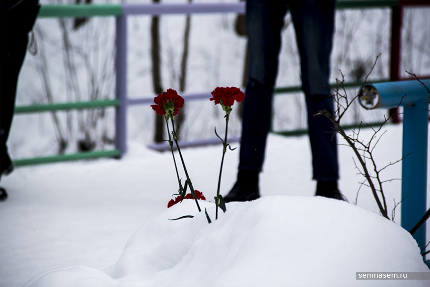 Участники акции собираются у моста, втыкают в снег гвоздики, ставят у парапета портрет Бориса Немцова, который 40 дней после его гибели простоял на Студенческом бульваре. Всех и все снимают на видеокамеры двое полицейских.