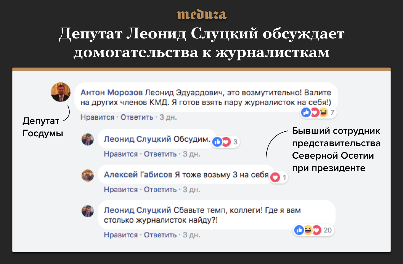 Дата26.02.2018АвторСкрытИсточникМедузаСохранённая копияInternet ArchiveOriginal MaterialShow translationДепутата Леонида Слуцкого обвинили в домогательствах к журналисткам. Как это обсуждают в его фейсбукеТри журналистки обвинили депутата Госдумы от ЛДПР Леонида Слуцкого в домогательствах. Он все обвинения отверг — и теперь обсуждает домогательства в фейсбуке. Фото в анонсе: Александер Щербак / ТАСС / Vida Press