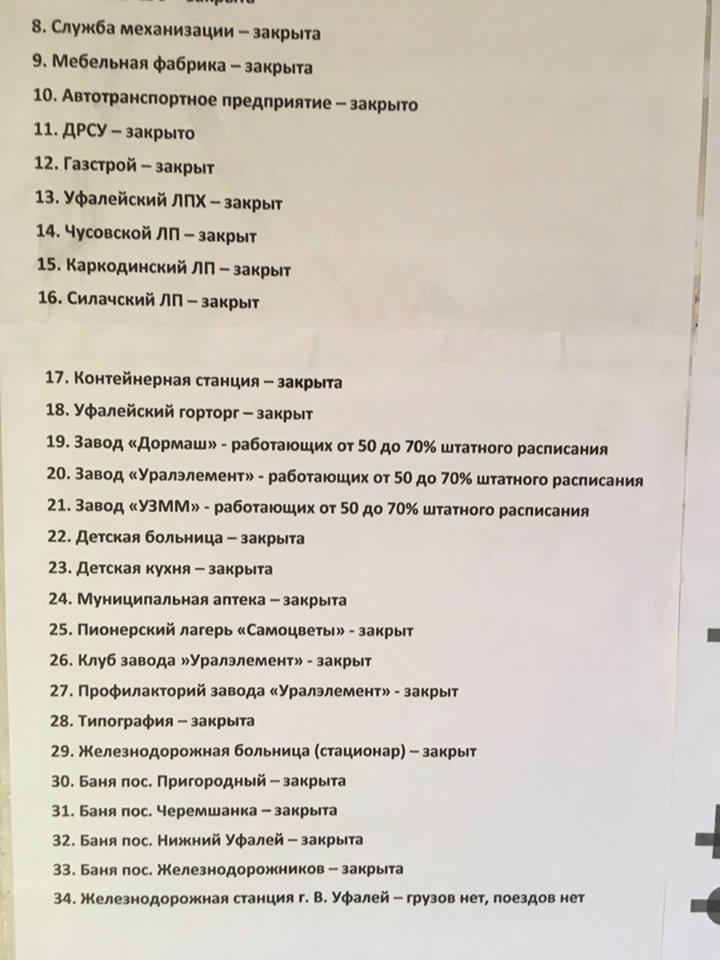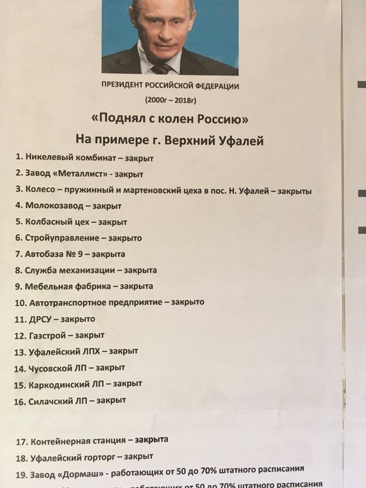 – Я живу очень много лет в Верхнем Уфалее, родился и вырос здесь. И накануне президентских выборов решил сделать подборку: что изменилось в нашем городе за 18 лет правления Владимира Путина. Какие предприятия закрылись? У нас был огромный, градообразующий, ордена Октябрьской революции никелевый комбинат – закрыт. Завод "Металлист" закрыт. Колесо-пружинный, мартеновский цеха закрыты, и пошло-поехало, колбасный цех, молокозавод, мебельная фабрика… Там 37 пунктов, в том числе детская больница, стационар на железной дороге. И те заводы, которые мало-мальски дышат, – я там тоже о них написал – например, на металлургическом заводе работало 5 тысяч человек, а сейчас максимум 500–700 человек.