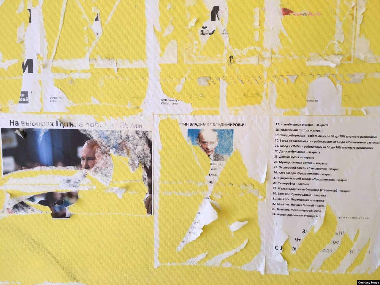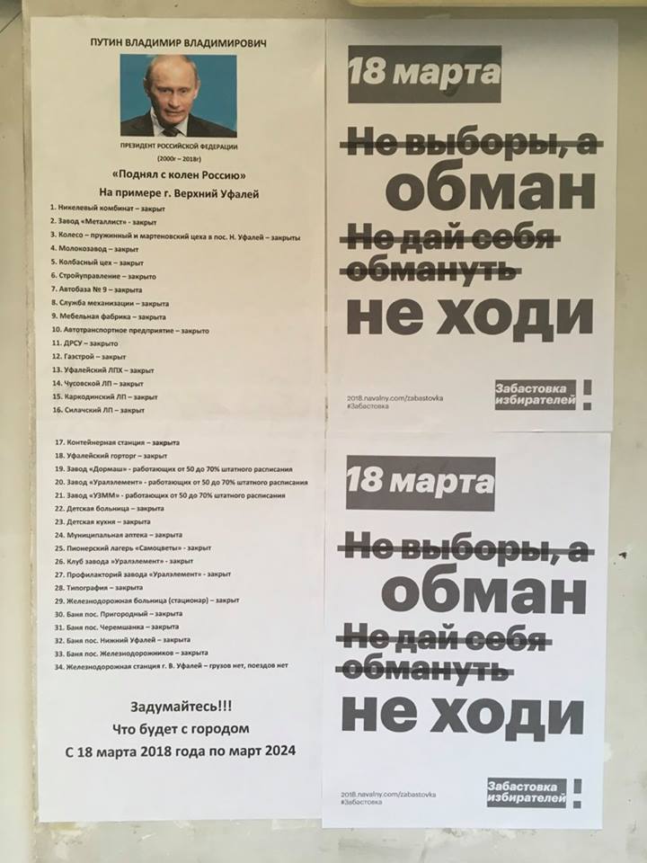 В Верхнем Уфалее Челябинской области полиция сорвала со стен нескольких магазинов плакаты с информацией о "блестящих" результатах правления Путина в отдельно взятом городке. Их повесил местный предприниматель, которому уже приходилось таким способом бороться против властей.