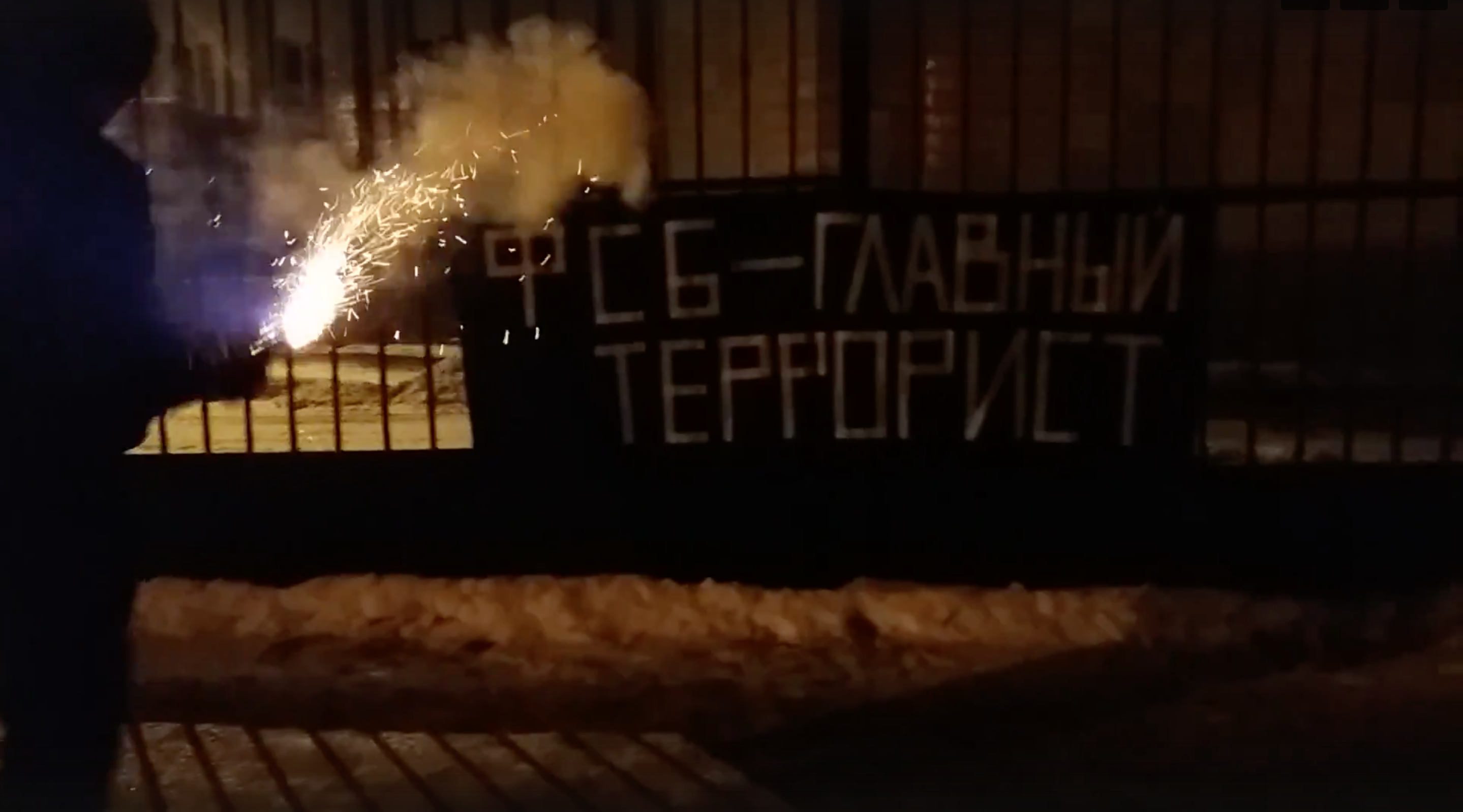 Растяжка «ФСБ — главный террорист» появилась на заборе челябинского управления ФСБ на улице Коммуны в ночь с 14 на 15 февраля. «В знак солидарности с репрессируемыми по всей стране анархистами в Челябинке навестили здание УФСБ», — объясняли авторы лозунга свой жест поддержки арестованных по «пензенскому делу». На видеозаписи можно разглядеть три фигуры в черном, которые вешают баннер, после чего один из активистов поджигает файер и бросает его через забор.