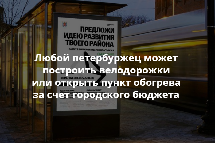 В Петербурге уже третий год проходит конкурс «Твой бюджет», благодаря которому горожане могут получить деньги из городского бюджета и улучшить жизнь в городе. Так, петербуржцы уже установили лагерь для бездомных и построили велодорожки на набережной Фонтанки.
