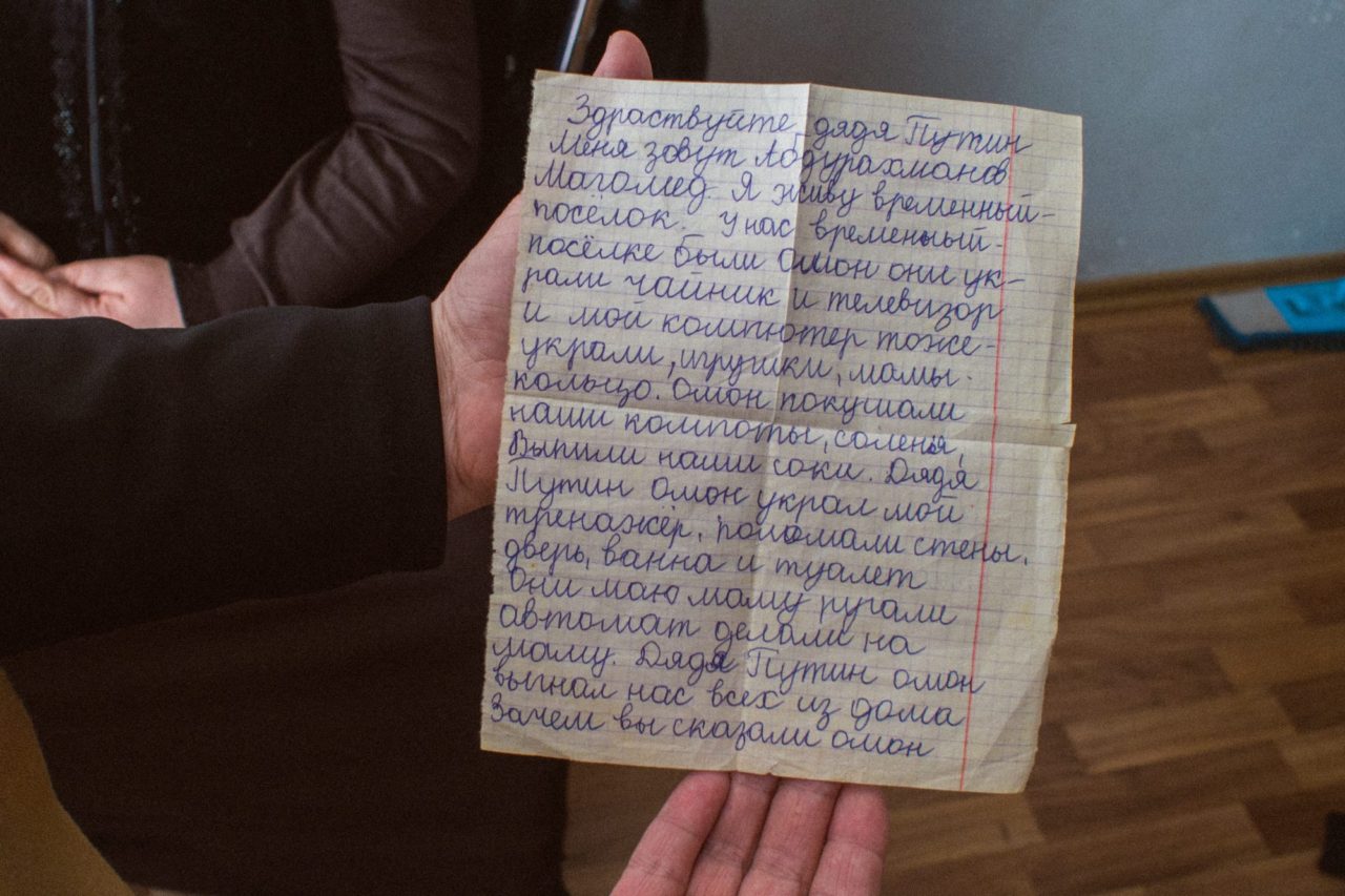 «Здравствуйте, дядя Путин (орфография и пунктуация авторские — ТД). Меня зовут Абдурахманов Магомед. Я живу Временный поселок. У нас временный поселке были омон они украли чайник и телевизор и мой компютер тоже украли, игрушки, мамы кольцо. Омон покушали наши компоты, соленья, выпили наши соки. Дядя Путин омон украл мой тренажер. Поломали стены, дверь, ванна и туалет. Они мою маму пугали автомат делали на маму. Дядя Путин омон выгнал нас всех из дома. Зачем вы сказали Омон выгнать нас из дома. У всех людей омон украл все все. Дядя Владимир, помогите нам всем всем школе садику мне маме тетя Джамиле».