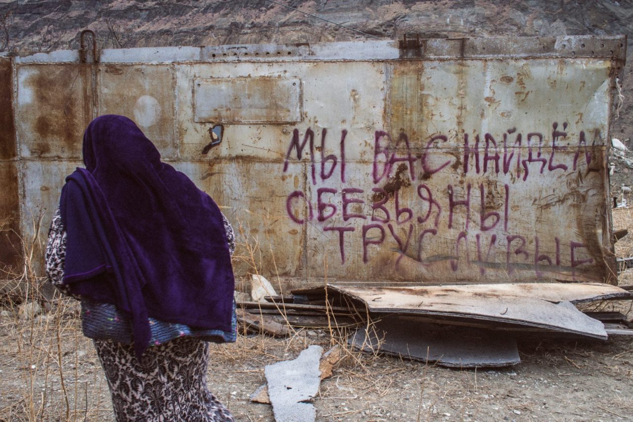 Надпись, оставленная после «зачистки» поселка от боевиковФото: Диана Хачатрян «Через год, пять или десять лет мы как-нибудь восстановим свое имущество, — сетует Джамиля. — Самое ужасное, что они уничтожили нашу память. Ничего у человека нет, как будто он вырос из-под земли. Так не должно быть, у каждого человека должна быть семейная история. У меня, например, не осталось ни одной фотографии бабушки или дедушки. Было обидно, когда в позапрошлом году на семидесятилетие Великой отечественной войны на доске висели фотографии разных ветеранов, а на месте моего дедушки было пустое окошко. Ну откуда я ее возьму, эту фотографию?! Ложку и чашку я куплю, а кто вернет мне фотографию деда? Кому-то это неважно, но я сохраняла открытки, которые своими руками мальчики делали мне на восьмое марта и на день рождения. Они тоже пропали».