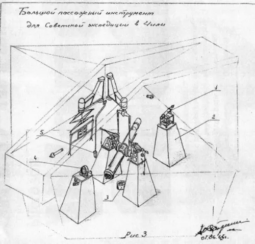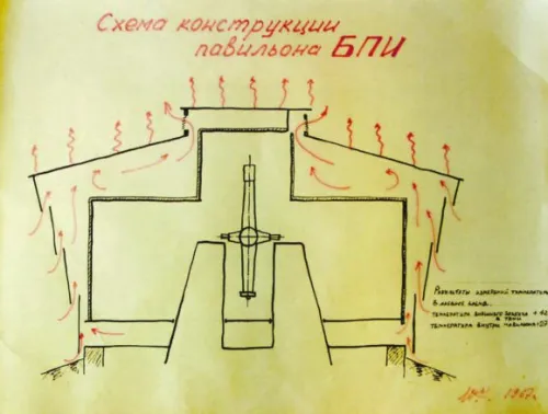 Чтобы инструмент не перегревался в дневное время, павильон нужно было обшить сверху белым металлом, покрашенным или оцинкованным; стенки — сделать наклонными по отношению к вертикали: они представляли собой большие жалюзи. Сам инструмент — окружить термоизоляционным чехлом, если можно так выразиться. То есть павильон задумывался как внутреннее теплоизолированное помещение: прямые солнечные лучи нагревали крышу, но само помещение от солнца было защищено. Между нагретой крышей — воздушное пространство; холодный воздух затягивался в это пространство и выходил через шанары наружу; таким образом, происходило естественное вентилирование.