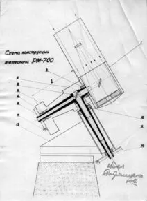 На вилочной параллактической монтировке была установлена труба менискового телескопа с диаметром мениска 700 мм. Телескоп перевезли в обсерваторию в Абастумани. Иоаннисиани считал, что это удачная конструкция, и мы планировали применить многое из нее для будущего пулковского телескопа. Но по требованию астрономов рефлектор должен был иметь фокус куде (от франц. coudé — согнутый, коленчатый), т. е. неподвижный фокус, и его надо было от подвижной трубы передать в неподвижную полярную ось. А такая оптическая схема уже диктовала другие условия для монтировки. Мы не могли сделать вилку, и тогда мною была предложена другая монтировка (в нашей литературе мы ее не видели), несимметричного типа. Там ось была сконструирована так: первое диагональное зеркало находилось в трубе, второе зеркало было установлено неподвижно внутри полярной оси.