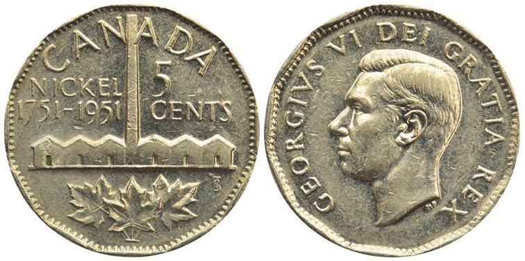 В конце XIX века к трем основным монетным металлам добавился четвертый — никель. Этот металл открыл в 1751 году шведский минералог Аксель Фредерик Кронстедт (1722–1765). Он исследовал красновато-бурую руду. По цвету она напоминает медь, и, когда средневековые немецкие горняки не сумели выплавить из этой руды металл, они назвали ее «купферникелем», то есть «чертовой медью» (от нем. Kupfer — медь и Nickel — злой горный дух, или гном). Кстати, когда-то по-русски (например, у Менделеева в «Основах химии») писали, по немецкому шаблону, «никкель». Канада — одна из ведущих стран мира, добывающих никель. И в 1951 году в честь 200-летия открытия этого важного для страны металла в Канаде была выпущена пятицентовая монета из никеля.