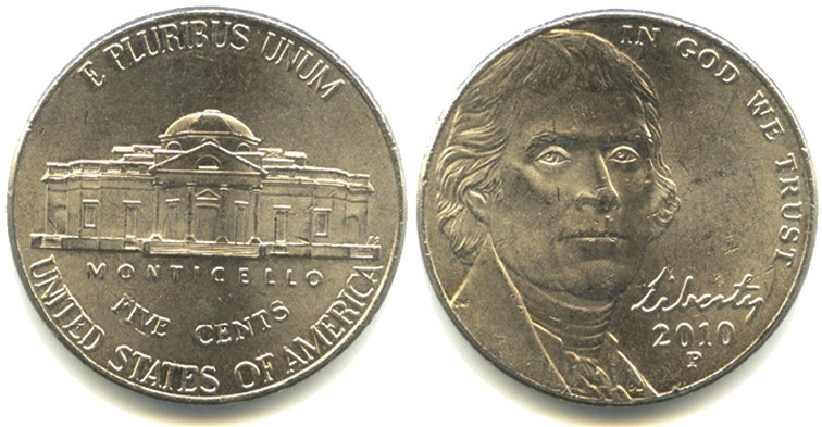 В США пятицентовые монеты традиционно называют «никелями», хотя на самом деле их чеканят из медно-никелевого сплава, в котором никеля только 25% (рис. 2). Но уже 15% никеля полностью маскируют в сплаве цвет меди, делая его чисто-белым. Первые монеты в США из медно-никелевого сплава имели другой номинал — три цента; они заменили прежние трехцентовые серебряные монеты, и их чеканили с 1865 по 1889 год. Интересно, что 8 октября 1942 года в обращении в США появились «никели без никеля» — в их составе было 56% меди, 9% марганца и… 35% серебра! Причина проста: в конце 1941-го США вступили во Вторую мировую войну, и никель в больших количествах потребовался военным для изготовления стальной брони. Такие монеты чеканились вплоть до 1945 года. Много ли никеля можно было сэкономить? Только в 1941-м было отчеканено 300 152 000 пятицентовых монет массой 5 г каждая и общей массой 1500,76 т, из которых на чистый никель приходилось более 375 т. Это позволяло произвести почти 10 тыс. т крупповской брони!