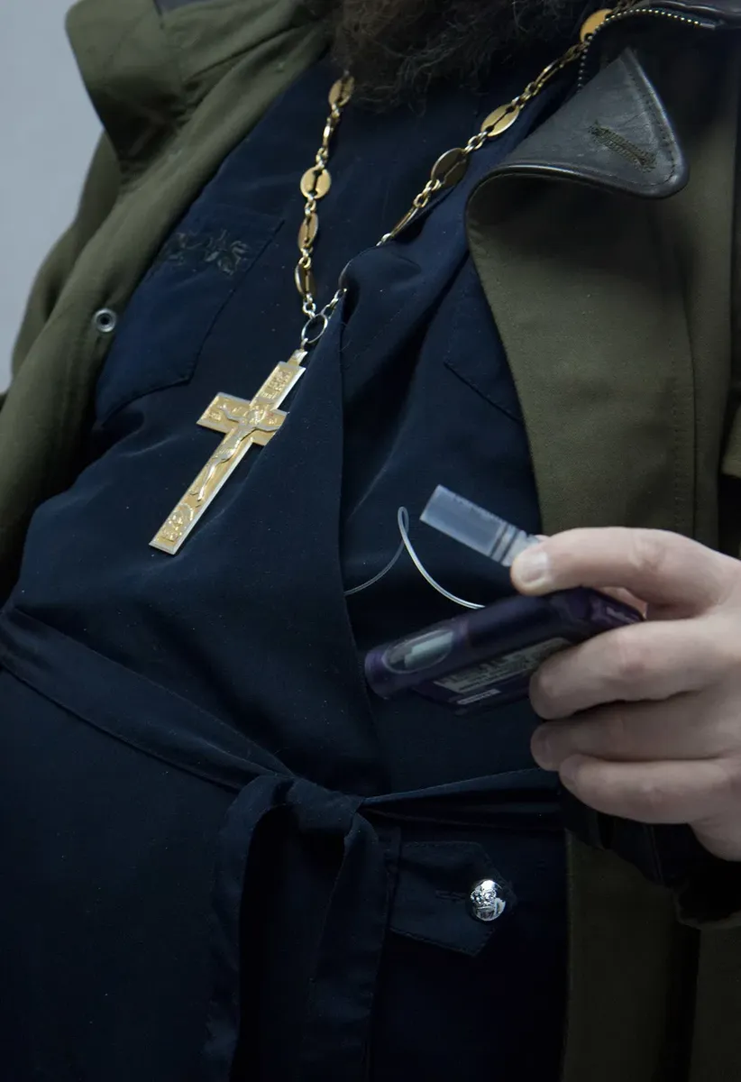 Раздав наборы, священник достает из-за пазухи инсулиновую помпу с трубочкой, убегающей внутрь подрясника, и на пальцах объясняет принцип ее действия.