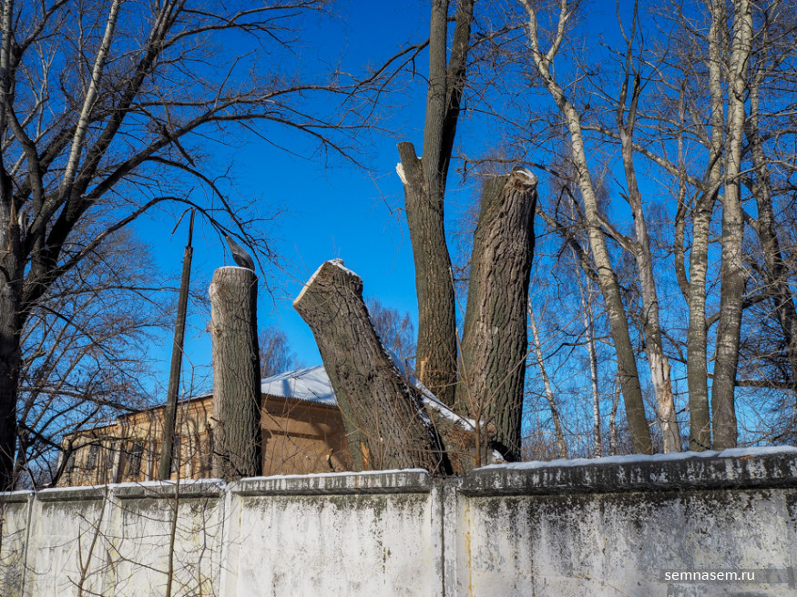 Проезжаем чуть дальше вдоль бетонного забора в надежде увидеть старые здания. В одном месте есть пролом, но вход завален старыми спиленными деревьями.