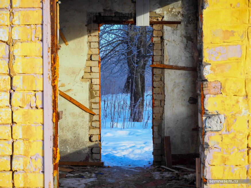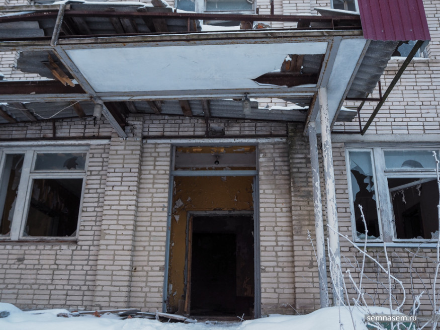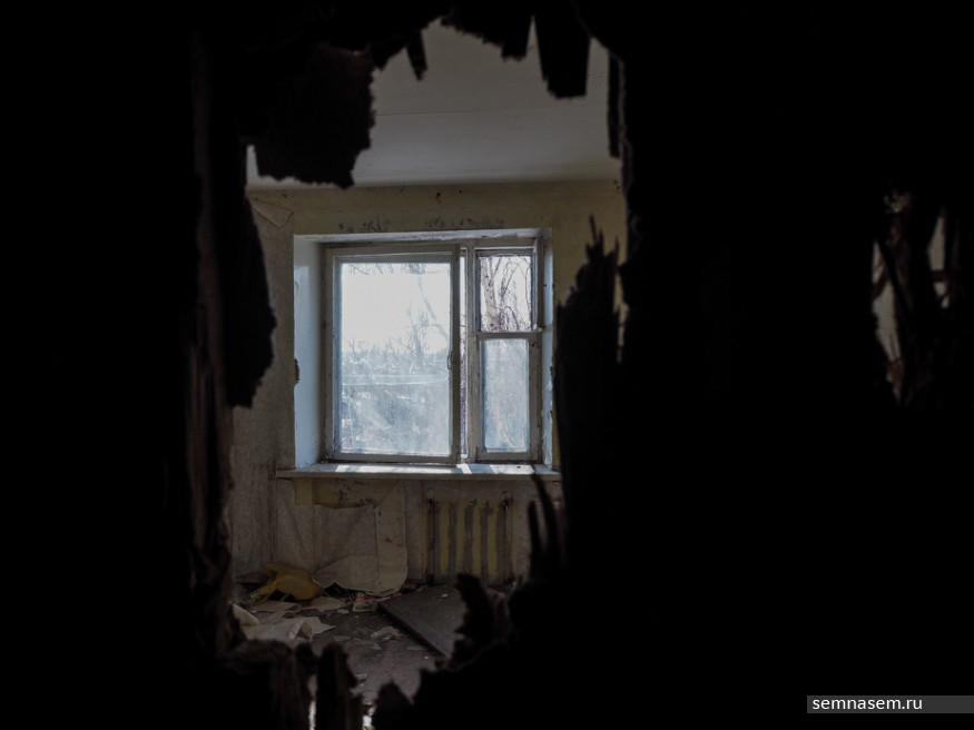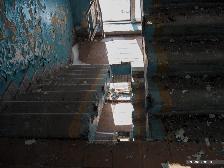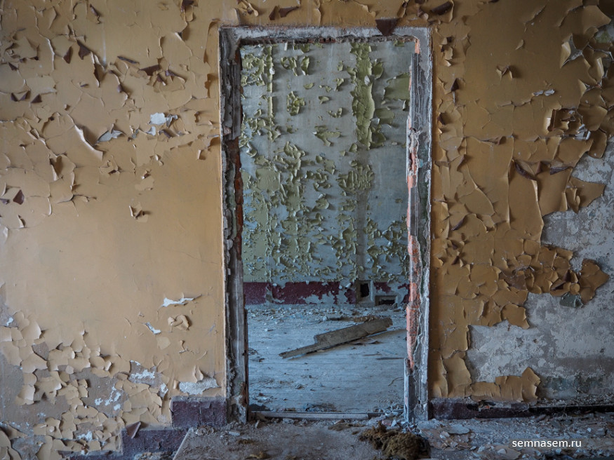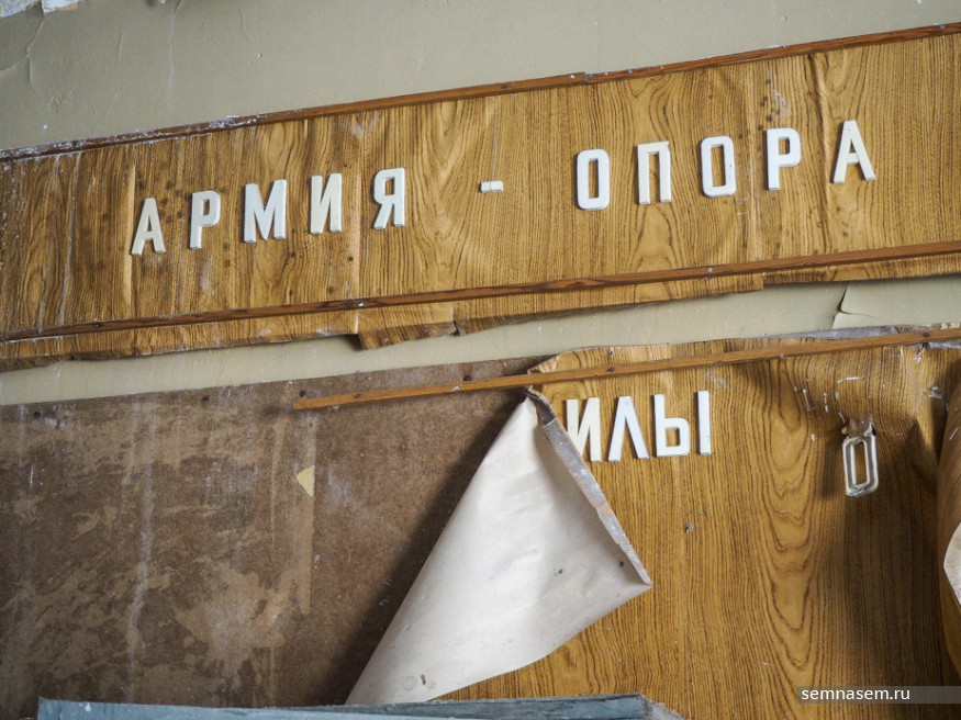 Справа — трехэтажное здание. При входе на полу валяются валенки большого размера, бушлаты, оторванные рукава шинелей и камуфляжи. Обломки стульев и столов, табличек, которые некогда висели на дверях кабинетов — все разбросано по бетонному полу с остатками линолеума. Под ногами хрустят осколки стекла.
