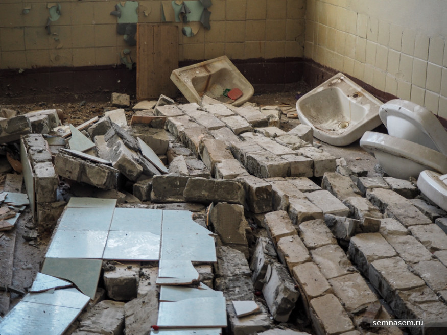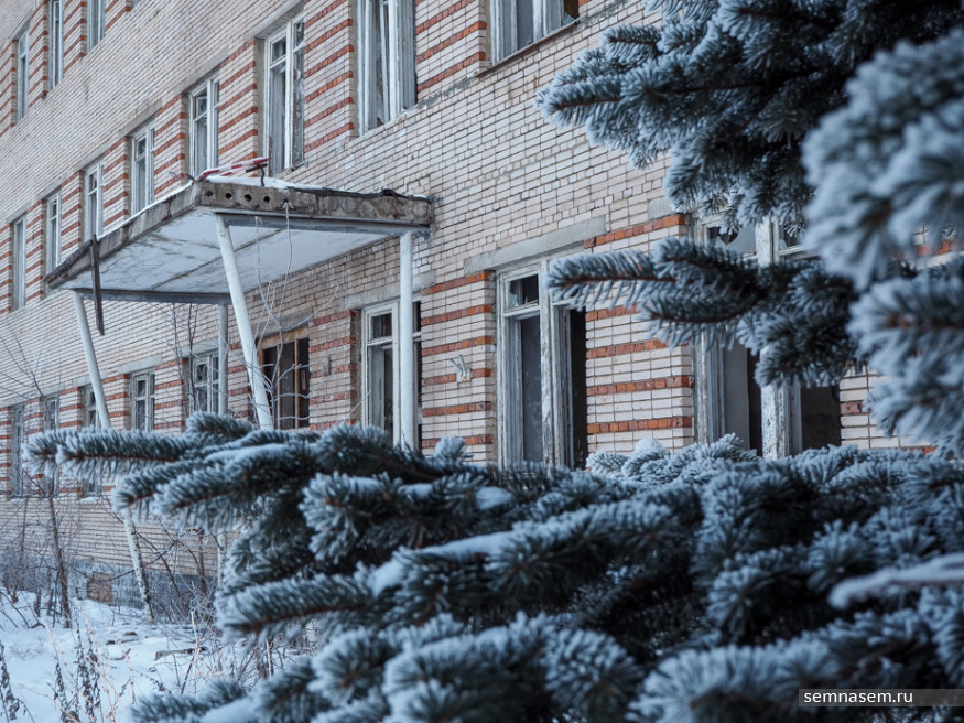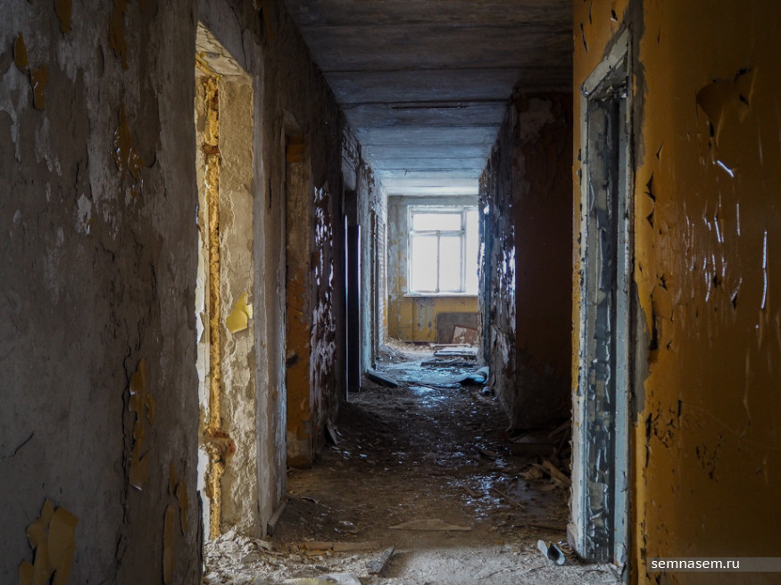 В этом здании на каждом этаже можно найти сломанные кровати и разбитые раковины, полки на стенах, тюль и шторы, даже разбитый цветочный горшок с замерзшими комьями земли и засохшим стеблем растения. Туалетная и душевая комнаты разгромлены. Судя по обстановке, здесь была казарма.