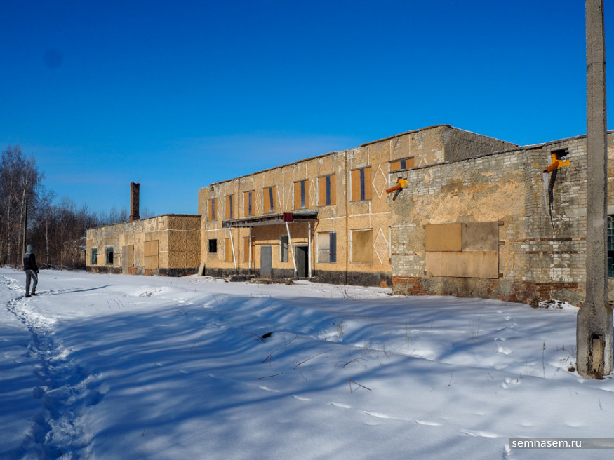 Отправляемся по протоптанной тропинке к еще одному зданию, центральная часть которого двухэтажная, правое крыло и левое — в один этаж. Часть оконных проемов забита фанерой. В здании располагались учебные классы, рядом — малый артиллерийский полигон.